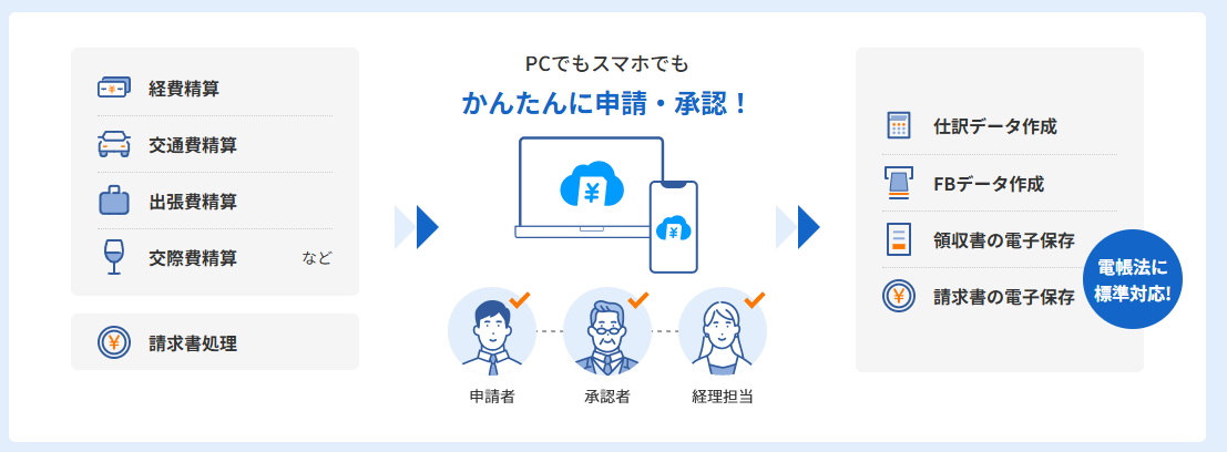 クラウド型 Web サービス(SaaS)。ブラウザおよびスマホから申請・承認操作可能。ワークフロー・会計ソフト連携・電子保存・AI-OCR 等の拡張機能あり。