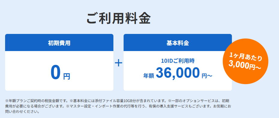 10IDご利用時で月額 3,000 円(税抜)~。年額契約プランあり。オプション機能(AI-OCR・交通系 IC/モバイル電子マネー連携・添付ファイル容量追加等)は別料金。初期費用 0 円。