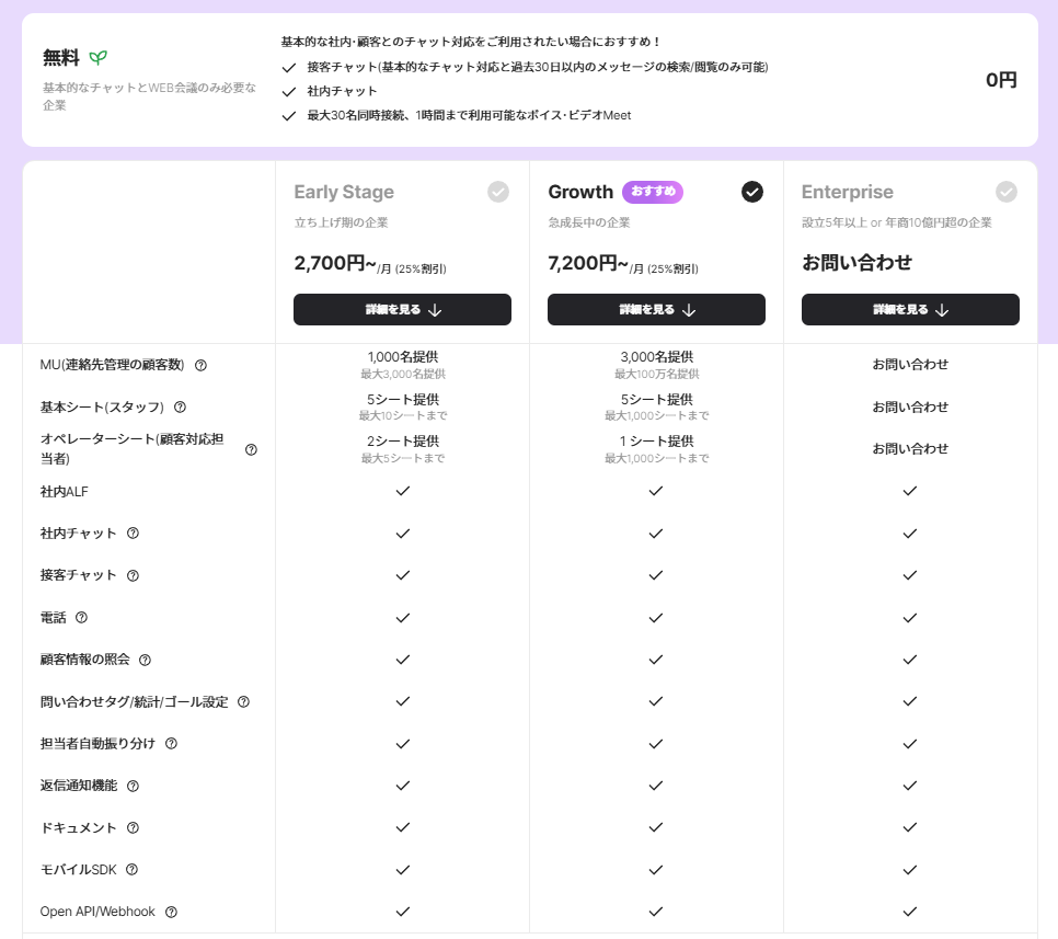 無料プランあり。主な有料プラン「Early Stage」「Growth」「Enterprise」など。例えば、Growth プランは月額 US$72。チャットルーム・Managed Users(顧客プロファイル数)・Seats(オペレータ等ユーザー数)などによって変動。使用量ベースのアドオンあり。