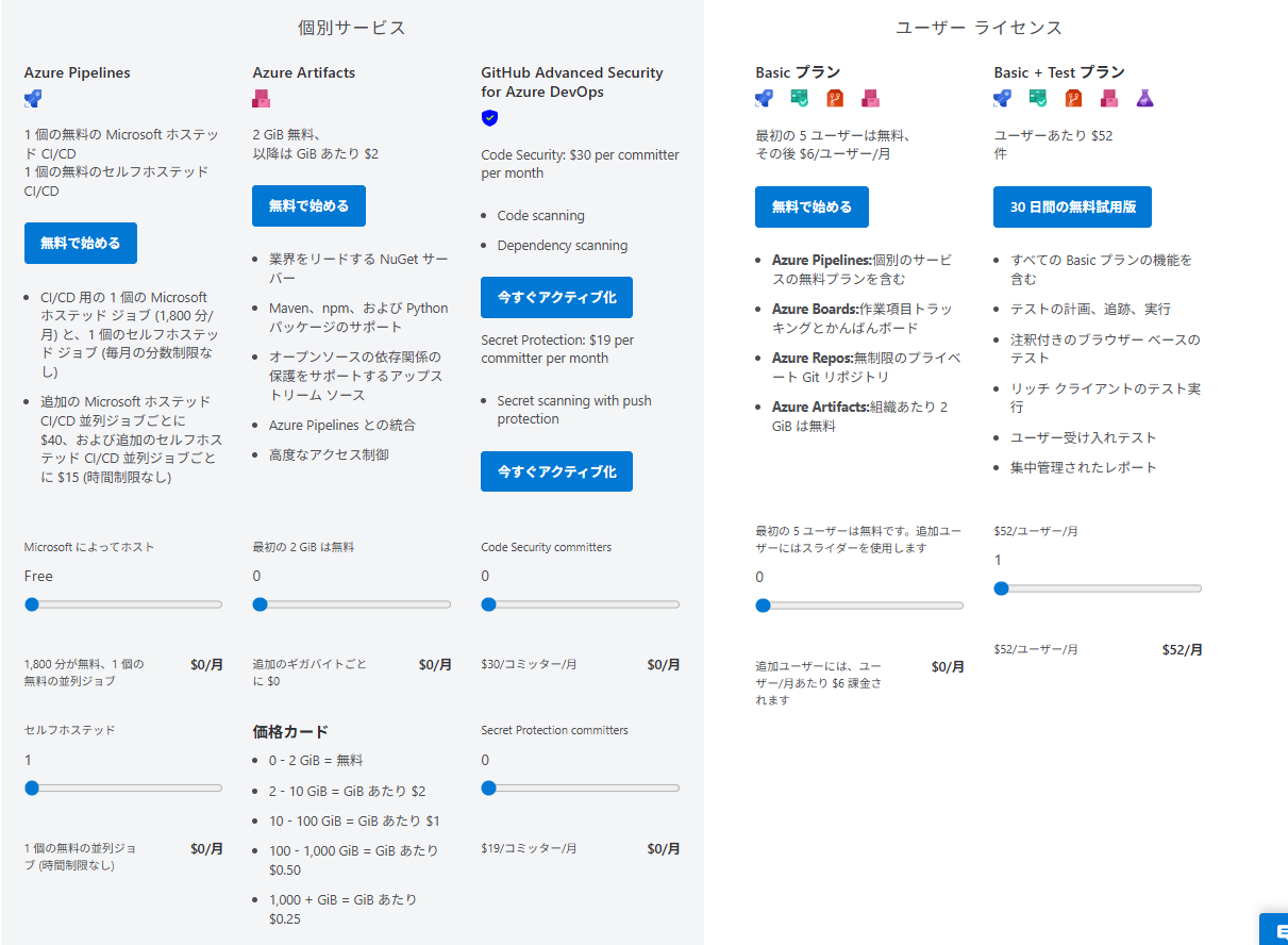 “Azure DevOps Services” の主な価格モデルは次の通りです:最初の 5 人の “Basic” ユーザーは無料、その後の Basic ユーザーは **US$6/月**/人。 “Basic + Test Plans” 権限のユーザーは US$52/月/人。ストレージ・アーティファクト保存は 2 GiB までは無料、それ以上はギガバイト単位で課金。CI/CD(Pipelines)は Microsoft-hosted agent のジョブ数・利用分数に応じた課金方式。