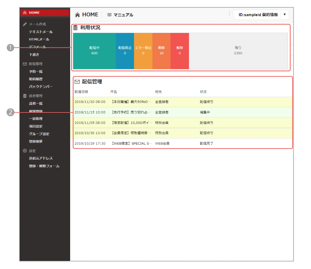 直感的に操作できるシンプルな操作画面で、HTMLメールも簡単に配信できます。新規登録・検索・編集・削除ができる読者管理機能もあります。