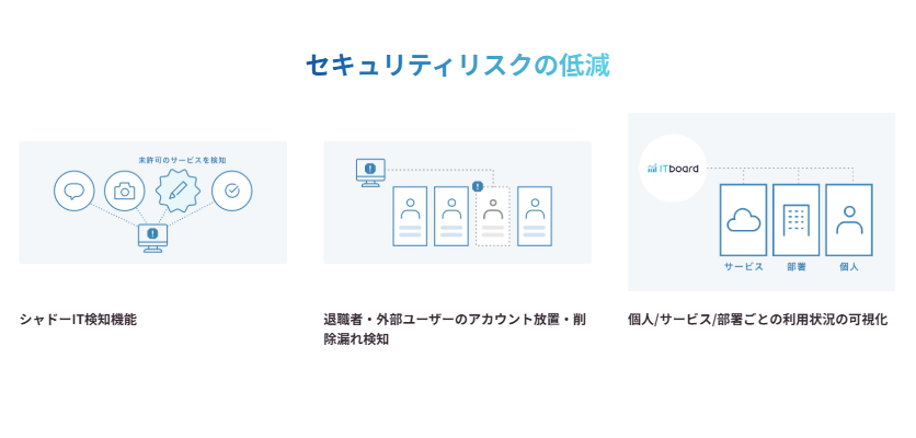 ITboard はアイティクラウド株式会社(ソフトバンクグループ)が提供する SaaS 管理プラットフォームで、社内で利用されている各種 SaaS のアカウント・利用状況・コスト・契約情報を一元管理できる点が特長です。シャドーIT(許可されていない SaaS 利用)の検知、退職者アカウントの放置防止、契約更新漏れの通知など、情報システム部門の工数とセキュリティリスクを低減する機能が充実しています。操作画面は直感的で使いやすく、専任担当者が導入から活用まで伴走するサポート体制も備えています。
