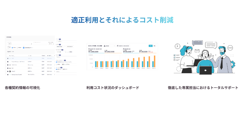契約中の SaaS の契約期間・料金・更新日をまとめて管理し、更新忘れや稼働していない期間の料金支払いなどのムダを防止。コスト推移をグラフで可視化し、予算策定やコスト見直しを定期的に行いやすくします。専任サポートにより導入から運用まで手厚く支援される点も特徴です。