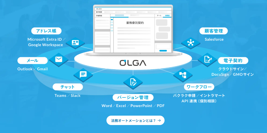 OLGAは、法務部門の依頼受付から契約レビュー、契約管理までをクラウドで一元化する法務オートメーションプラットフォームです。AIによる契約書レビューや類似案件のレコメンド、自動台帳生成、進捗の可視化などで属人化や手作業を解消。Slack・Teams・メールなど既存のツールで依頼できるため、事業部とのやりとりもスムーズです。電子契約との連携や期限通知機能により、契約管理の効率化とリスク低減を同時に実現します。