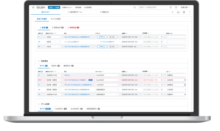 OLGAは、法務依頼をメールやチャットに分散させることなく、フォーム・メール経由で一元管理。契約レビューもAIが支援し、過去案件との比較やリスク検知を自動化します。進捗状況や履歴が可視化され、属人化を防ぎながら効率的に業務を遂行できます。契約書の締結から管理、期限通知までを包括的にカバーし、法務部門の生産性を飛躍的に向上させます。