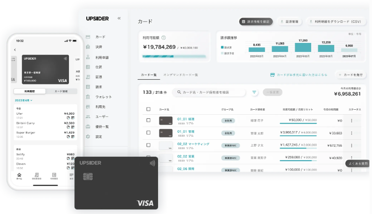UPSIDERは、スタートアップから上場企業まで幅広く利用されている法人カードサービスです。最大10億円の利用限度額を提供し、年会費・発行手数料無料。利用先を260以上のサービスに限定可能で、不正利用リスクを極小化します。証憑はアプリやSlackから簡単に提出でき、電子帳簿保存法・インボイス制度にも自動対応。リアルタイムで会計ソフトと連携し、月次決算を早期化。世界中のVisa加盟店で利用でき、補償・サポートも充実しています。
