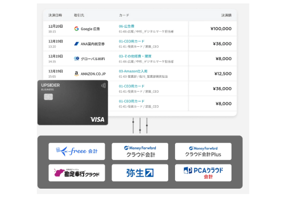 UPSIDERは、独自与信により最大10億円までの限度額を提供。大規模な広告費や取引にも対応可能です。決済データはリアルタイムで反映され、月初1日には明細が揃い会計ソフトに自動連携。freee、マネーフォワード、弥生、勘定奉行など幅広い会計ソフトに対応し、月次決算のスピードを大幅に改善します。