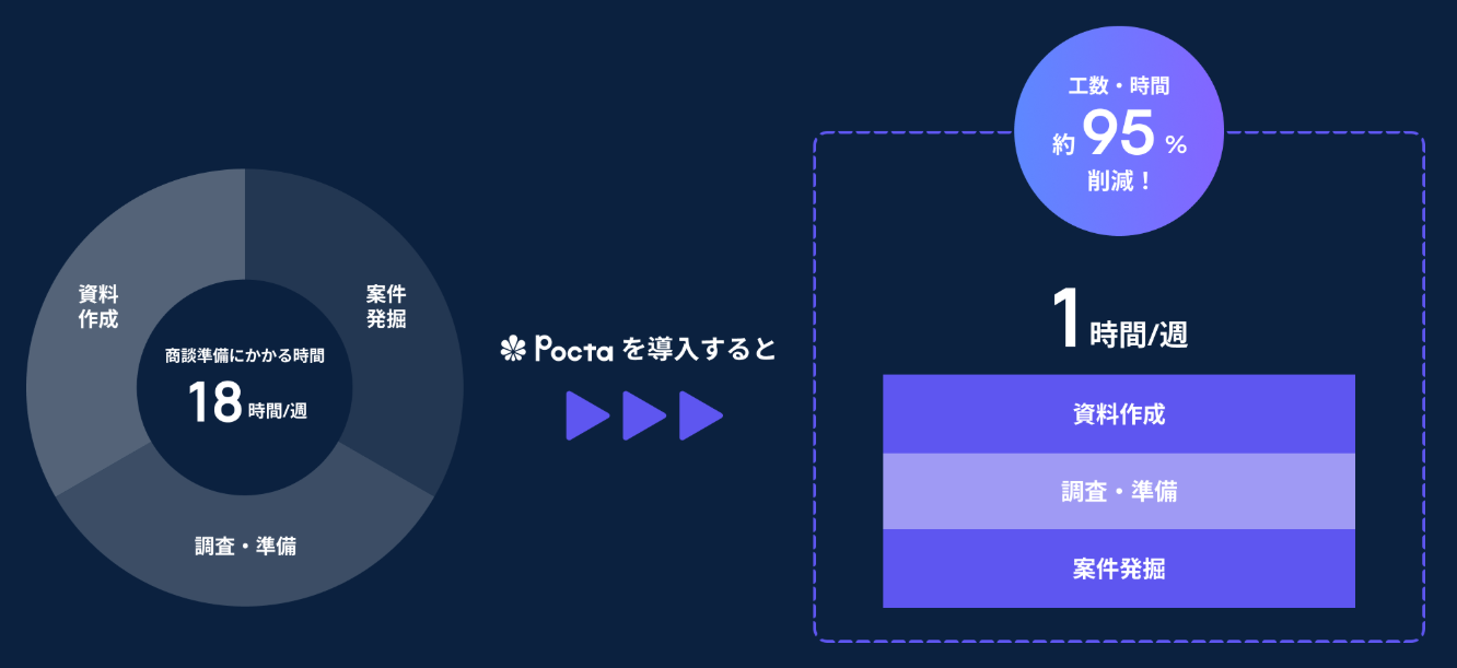 「Pocta」はBtoB営業支援のために開発されたAIサービスで、情報の検索や資料の共有、営業スキルの向上を効率化します。AIを活用し、営業担当者が必要な情報を迅速に見つけられるように設計されています。これにより、営業活動の時間を大幅に削減し、業務効率の向上を実現します。また、ユーザーに対して具体的なアドバイスを提供し、営業力を強化します。