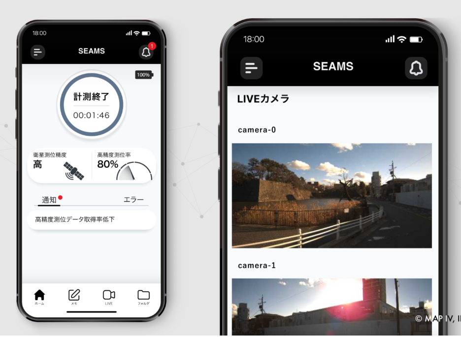 SEAMS LXは、電力・道路インフラ設備の保全管理や3次元測量に特化した車載型データ計測システムです。マルチセンサー(カメラ×8、LiDAR×2)を搭載し、走行中に周囲の3次元形状や位置情報を取得することができます。また、直感的な操作が可能なユーザーインターフェースを採用しており、技術的な知識がなくても容易にデータ計測が行えます。さらに、マップフォー独自のSLAM技術により、従来のMMSと同等の精度を実現しながら、コストを約1/10に抑えることが可能です。