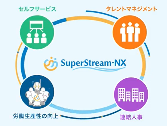 「SuperStream-NX」は会計・人事給与分野に特化した経営基盤ソリューションで、国内で9 000社以上に提供実績があります。UXを全面刷新し、操作性や人事部門のニーズに応える機能を新たに取り入れています。これにより、業務の負担軽減と労働生産性向上を支援します。また、タレントマネジメント機能やグループ全体での人財情報管理が可能で、業務の効率化を図っています。