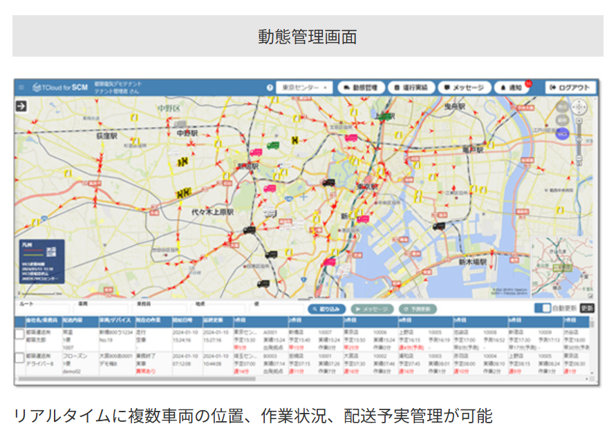 TCloud for SCMは、スマートフォンを活用して配送車両の位置・到着・滞在状況をリアルタイムに見える化するクラウド型の動態管理サービスです。取付工事が不要で、委託車両を含む混在環境でも一体管理が可能。地図上での進捗把握や遅延兆候の早期検知に加え、デジタコや配車計画システムとの連携、ライト版Webアプリの提供などで導入の柔軟性を高めます。将来的な機能として温度情報管理・到着時刻予測・納品先カルテ・CO2排出量計算などの提供も掲げ、物流KPIの可視化と最適化を支援します。