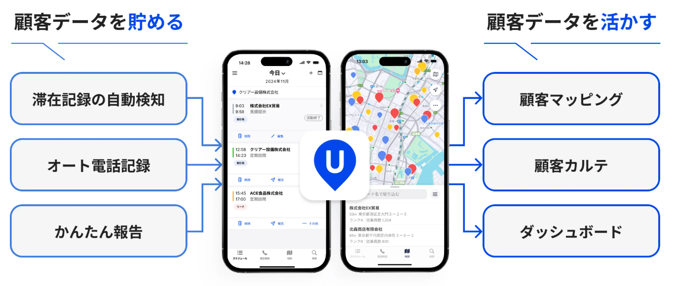 UPWARDは、地図とCRMを連携し、現場での滞在を自動検知・自動記録するフィールドセールス特化のSaaSです。スマホアプリで訪問開始/終了や滞在時間を自動ログ化し、日報・活動報告を数タップで完了。地図上で「今行くべき顧客」を可視化し、近隣顧客検索や経路表示で移動のムダを削減します。SalesforceやMicrosoft Dynamics 365と連携し、顧客情報はCRMに即時反映。AI要約/自動スケジューラーや画像解析「AI Scan」など外回りに特化したAI機能で、入力漏れ防止と提案スピード向上を同時に実現します。