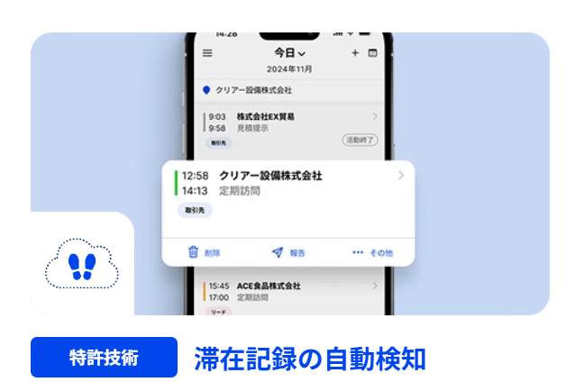 スマホの位置情報を用いて訪問先候補を検知し、滞在開始/終了や滞在時間を自動で記録。活動内容は1画面で関連レコードとまとめて入力でき、報告の手戻りを削減します。地図上では優先度の高い顧客や近隣顧客を可視化し、電話発信・経路案内・予定作成まで数タップで実行。入力の即時性と網羅性が高まり、最新データがCRMに自動反映。現場は商談に集中しつつ、管理側は正確な活動データで進捗と成果を可視化できます。