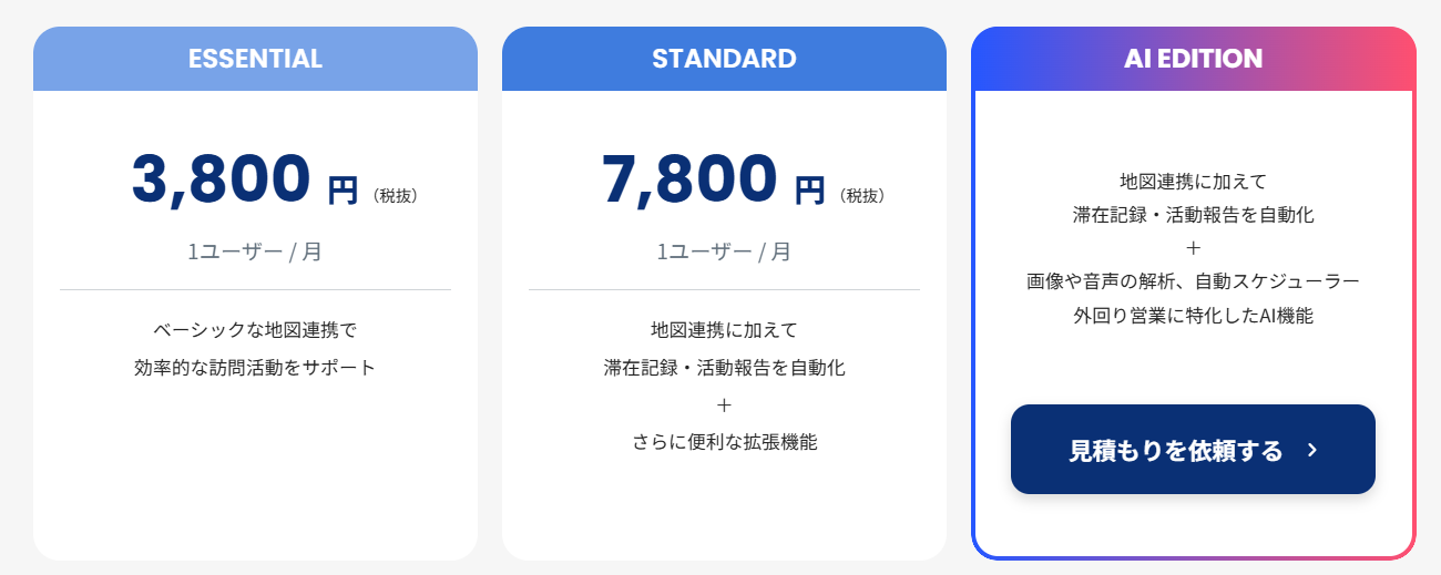 初期費用:100,000円(税抜)/最少25ID。STARTER:1ユーザー月額1,800円(税抜)/STANDARD:1ユーザー月額3,800円(税抜)。ESSENTIAL・STANDARDは管理者ライセンス9,000円×2ID(税抜)が必要。AI EDITIONは個別見積。