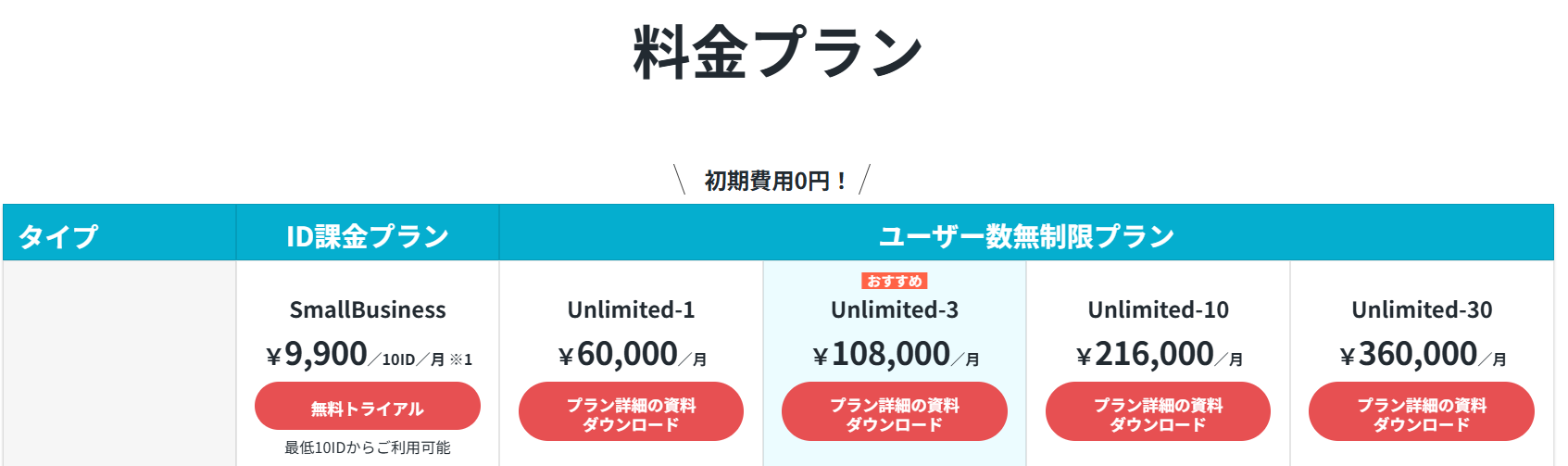 Small Business:¥990/ID/月(最低10ID)/Unlimited-1:¥60,000/月(1TB)/Unlimited-3:¥108,000/月(3TB)/Unlimited-10:¥216,000/月(10TB)/Unlimited-30:¥360,000/月(30TB)※いずれも税別・年契約/年払い、初期費用0円。