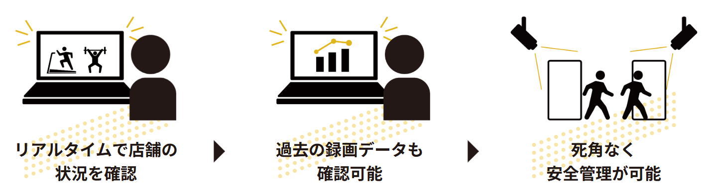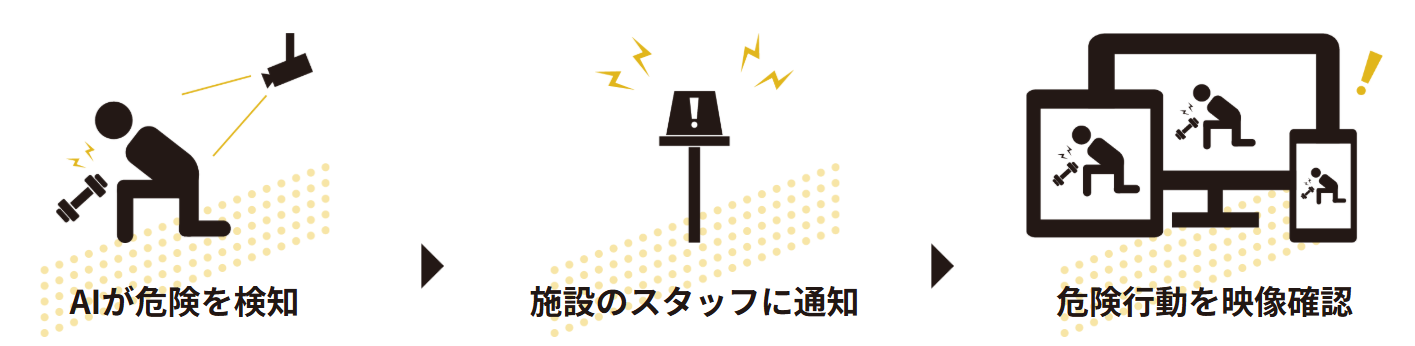 設置したAIカメラが不正入館や危険行動を自動検知し、管理画面に通知。マシン・エリア単位の利用率や時間帯別の混雑傾向を可視化し、スタッフ配置や清掃・点検の最適化に活用できます。混雑情報は会員にも配信できるため、来館分散と体験向上に直結。24時間化や省人運営でも安心・快適さを保ちつつ、運営コストと機会損失の低減を両立します。