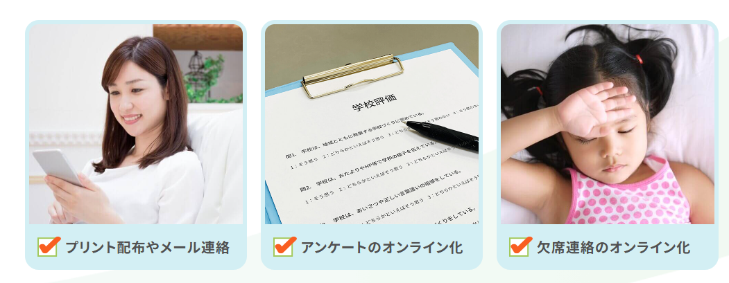 学校からの連絡はアプリのプッシュで即時に届き、外出先でも確認できます。PDFなどの配布物は添付で配信でき、期日設定があるお便りはカレンダーに自動連動して見落としを防止。保護者はアプリから欠席/遅刻連絡や体調入力、イベントの出欠回答ができ、メールや紙の往復を削減します。受信したファイルはアプリ内に自動保存され、必要な情報にすぐアクセス可能。印刷・配布・回収の手作業を減らし、先生・保護者双方の負担を軽減します。
