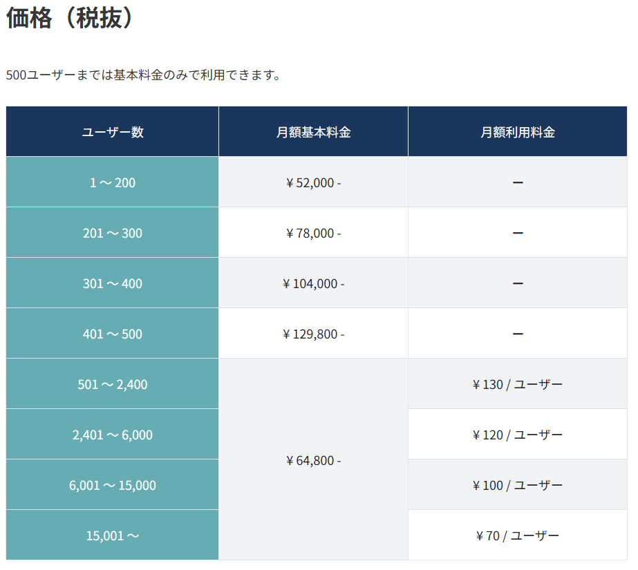 初期費用:なし。月額基本料 \49 800 + 利用ユーザー数 × 月額ユーザー価格(ユーザー数に応じて段階的に料金が変動)。