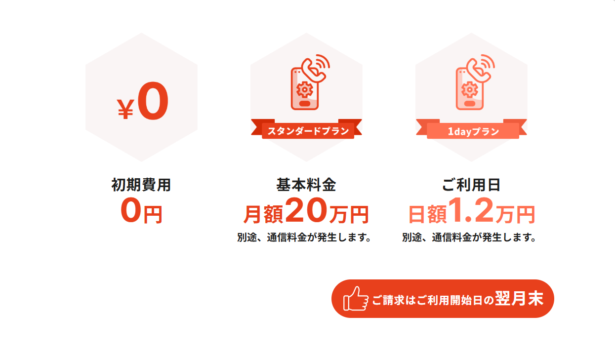 月額基本料金20万円(+通話料/秒課金)から。初期費用0円のプランあり。1日単位プランも選択可能。