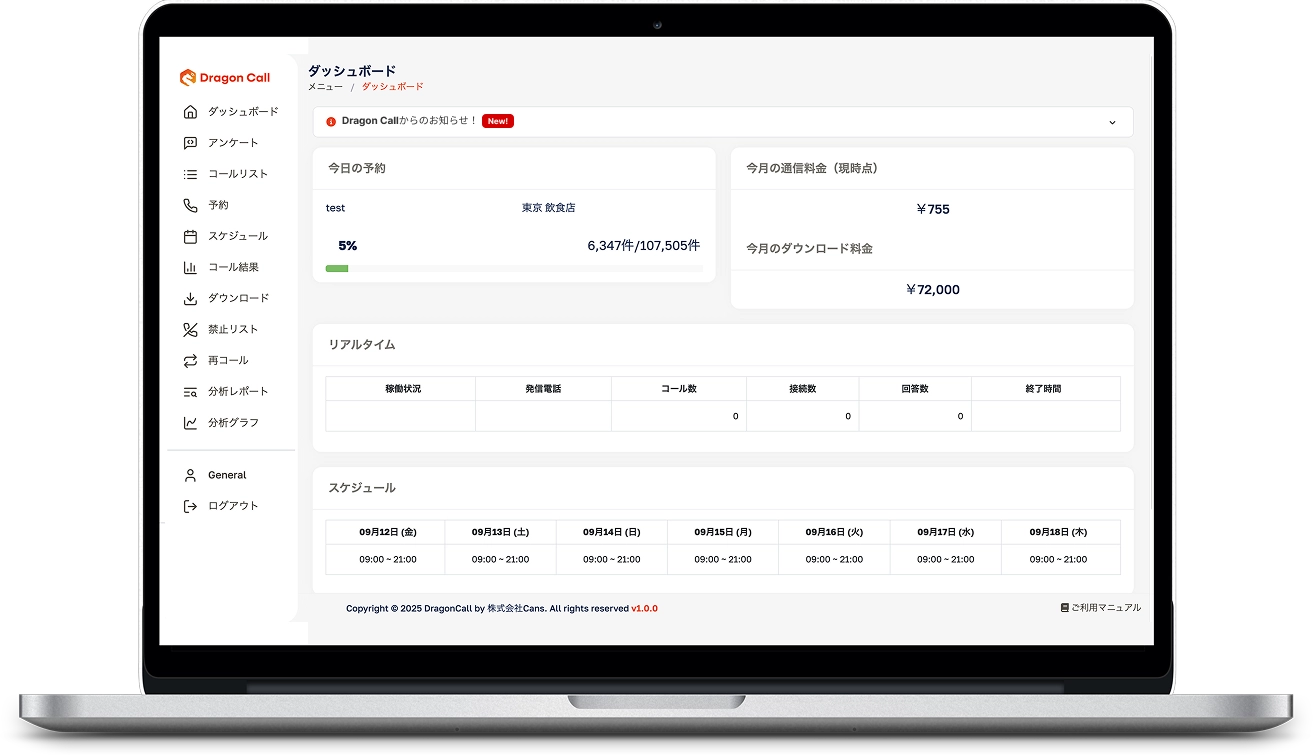 「Dragon Call」は、株式会社Cansが提供する法人営業向けオートコールシステムです。国内法人約600万件のデータベースを活用し、業種・地域などでターゲット絞り込みが可能。音声アンケート・分岐設定・スケジューリング予約など機能を備え、固定電話への大量架電を自動化し、営業活動の効率化と人件費削減を実現します。初期費用ゼロ、秒課金による通話料と月額利用料の二本立て料金体系です。