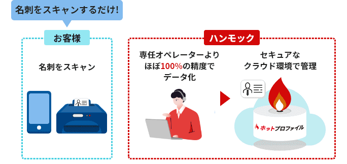 名刺をスキャナーやスマートフォンで読み込むだけ。あとは専任のオペレーターが補正入力します。セキュアなクラウド環境で管理されるので、どこからでも確認できます。