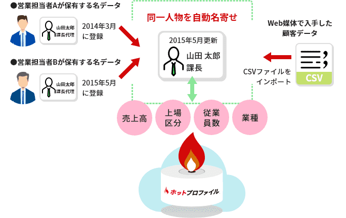 重複した複数の名刺やCSVデータも自動で名寄せを行い、人物ごとに管理できます。さらに業種・従業員数等の企業属性情報を自動付与し、アプローチしたい企業をかんたんに抽出できます。