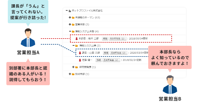 お客様との接点が一目瞭然となり、人脈を活かした営業活動が実行できます。全社で名刺管理を行えば、部門を超えて人脈を共有でき、新たな営業チャンスが生まれるかもしれません。