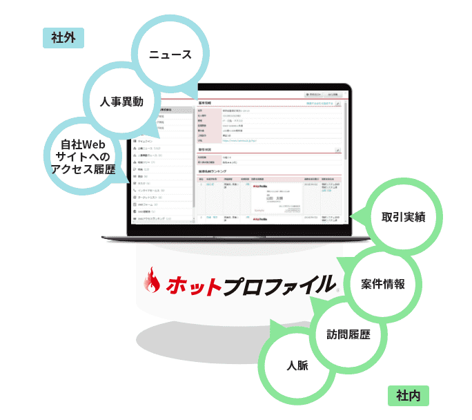 お客様に関するすべての情報が1画面に集約。忙しい営業担当者もこの画面を見るだけで、お客様の最新情報や興味・関心、過去の営業活動履歴などをかんたんに把握できます。