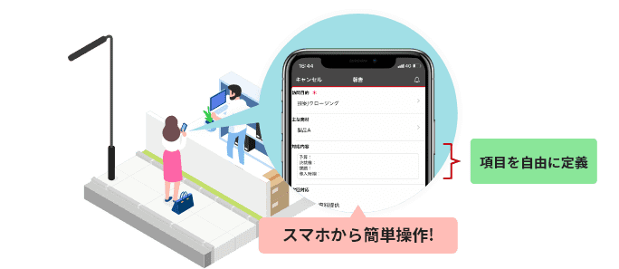 お客様情報と紐づけて営業活動履歴を管理できます。自社の運用に沿った項目を設定でき、お客様理解に必要な情報をモレなく管理できます。スマホでかんたん入力でき、営業現場の負担も最小限に抑えられます。