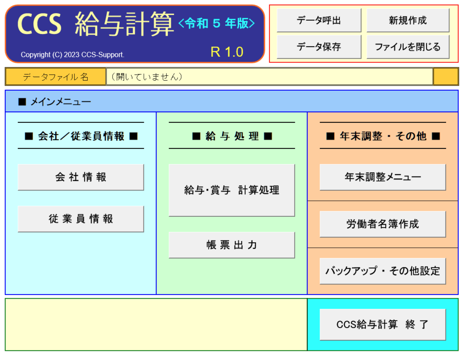 このソフトウェアは中小企業向けに設計され、令和5年度(2023年)の税法・社会保険料率の改正に対応しています。少ない入力と労力で、毎月の給与計算から年末調整までを一括で処理できます。1社につき1つのデータを作成し、従業員数100名まで対応。データ入力が必要な箇所は黄色のセルで着色されており、一目でわかります。