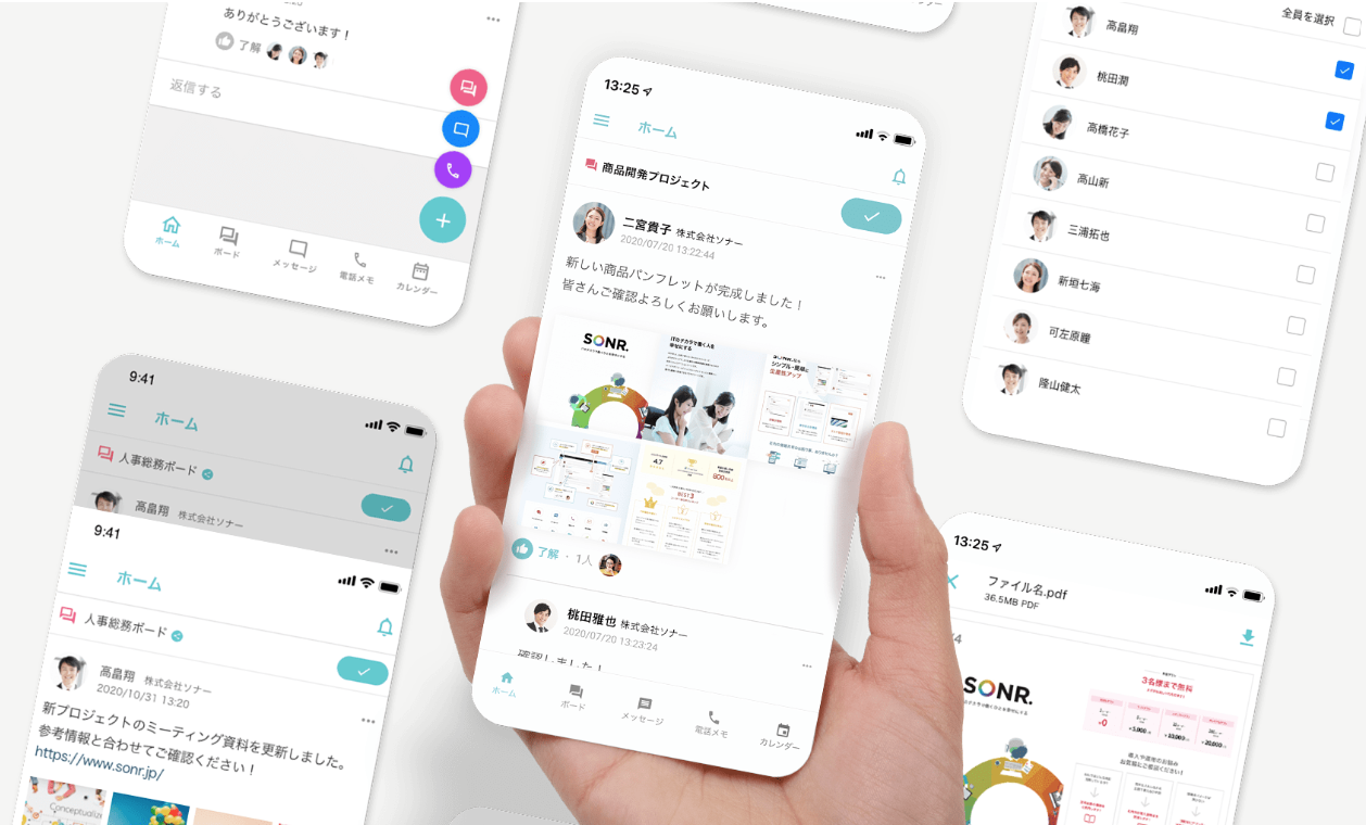 SONRはプロジェクトチームをつなぐコミュニケーションツールです。グループ掲示板、メッセージ、共有カレンダーなどの使い慣れた機能で、共同作業やコミュニケーションを活性化します。確認ボタンでタスク確認と情報共有がラクラク。多様な業種に使いやすい、仕事に必要な機能を集約しています。