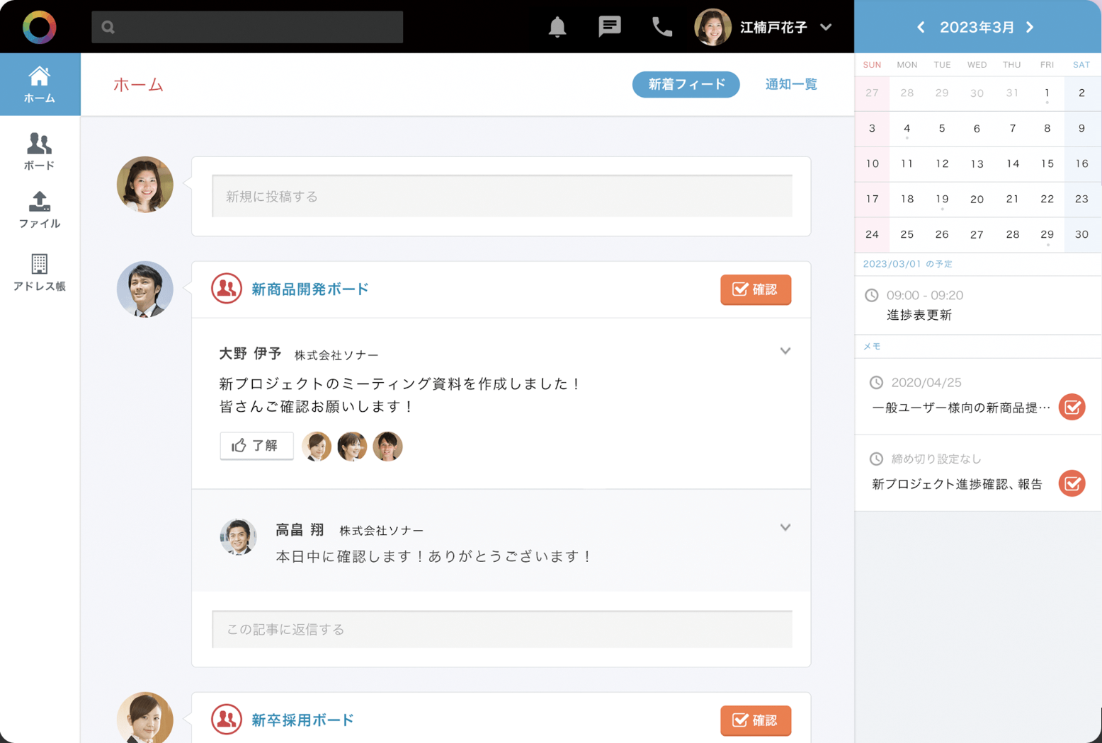SONRは、ディスカッションボードでテーマや話題ごとにディスカッションができ、タイムラインが混乱することがありません。確認ボタンで、終わった仕事を完了させていきます。共有カレンダーや電話メモ、ファイル共有など、仕事に必要な機能が一つに集約されています。