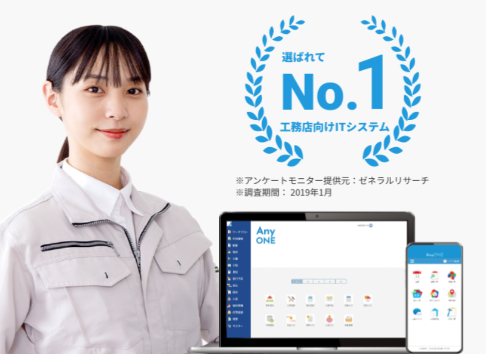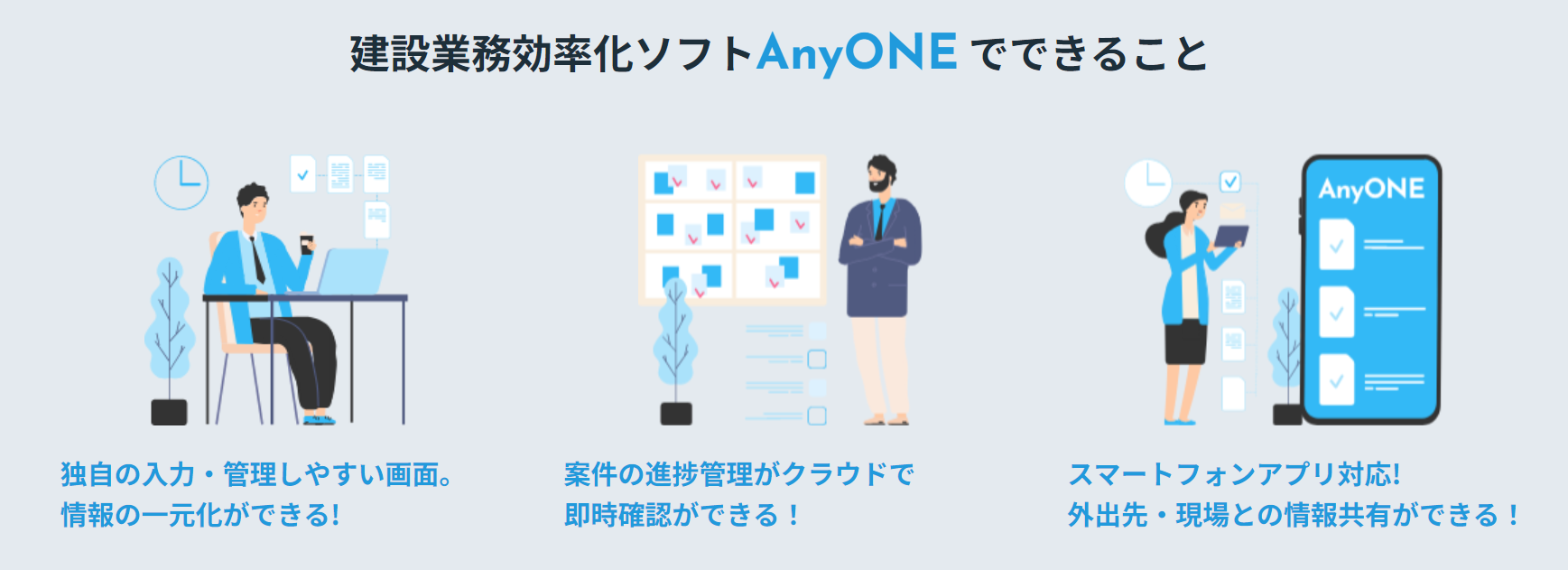 AnyONEは建設業に特化した業務管理システムです。顧客情報、工事・施工の進捗、見積もり、発注、入出金など、多岐にわたる情報を一元管理。スマートフォンアプリもあり、外出先や現場での情報共有も容易です。専門スタッフによるしっかりとしたサポートもあり、導入後も安心です。