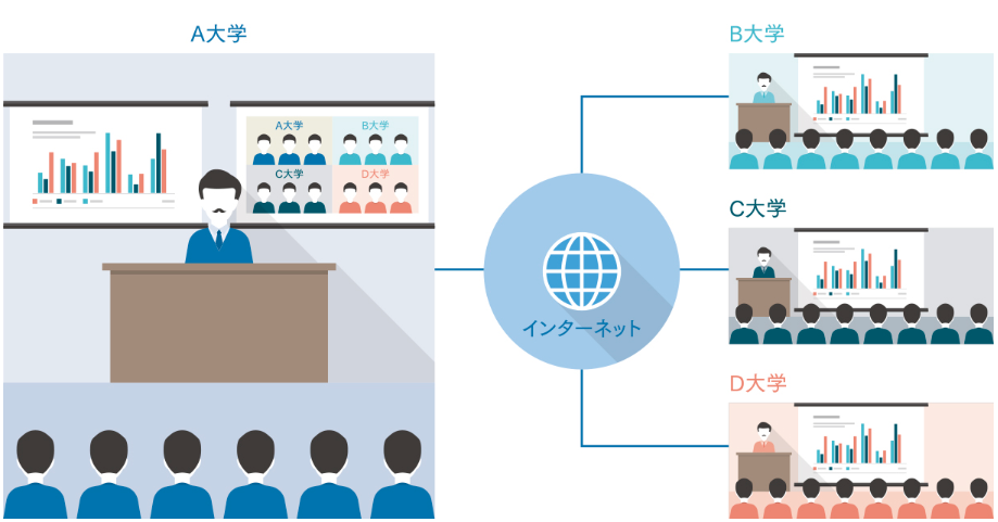 遠隔会議システムと遠隔講義システムを用いて、高画質での画面データ共有や双方向のコミュニケーションを実現。移動時間や経費を削減し、一度に多くの人が参加できます。