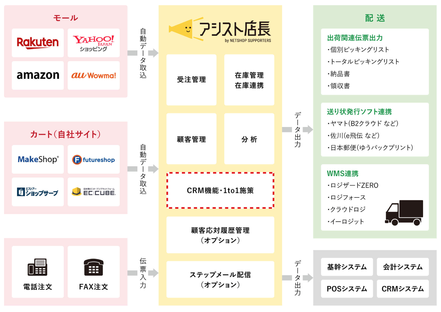 複数ECショップに入る受注を一元管理で、受注管理コストをアシスト店長がまるごとカバー。