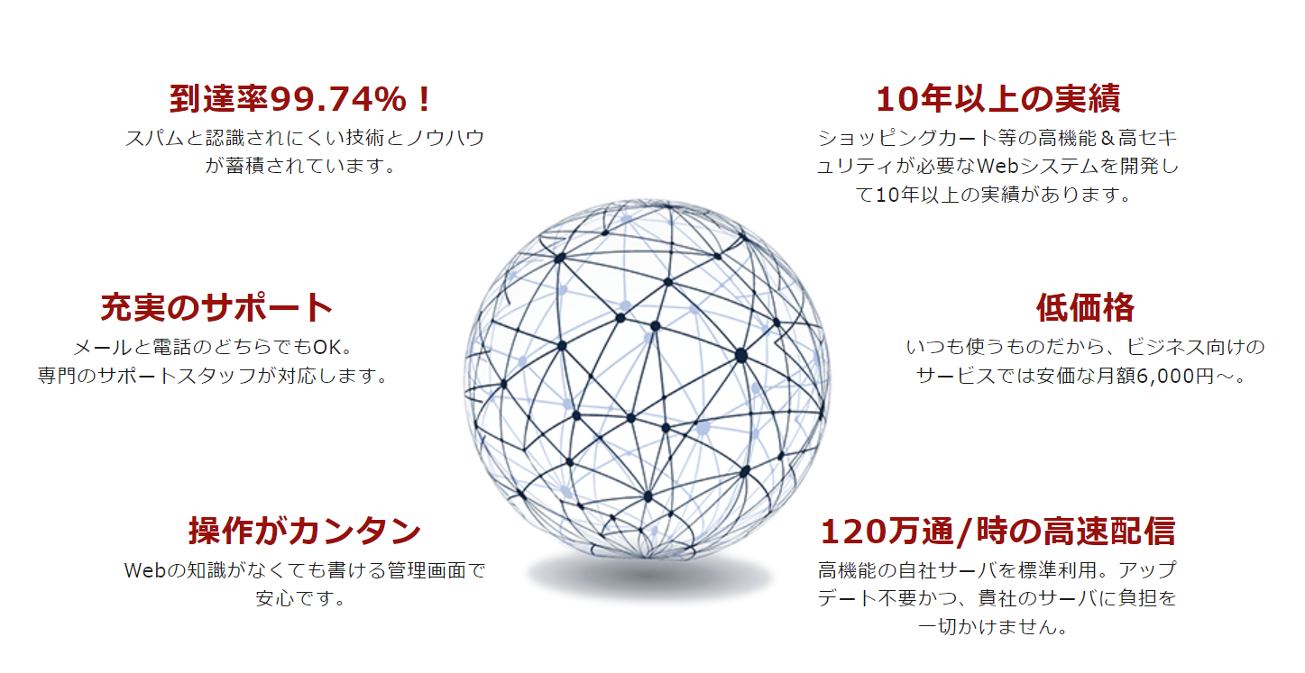 到達率99.74%の高い配信精度、10年以上の実績、充実のサポート、低価格の月額6,000円からのプラン、操作が簡単な管理画面、120万通/時の高速配信を提供。