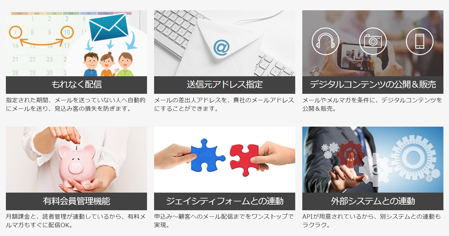 もれなく配信、送信元アドレス指定、デジタルコンテンツの公開&販売、有料会員管理機能、ジェイシティフォームとの連動、外部システムとの連動などの機能を持つ。