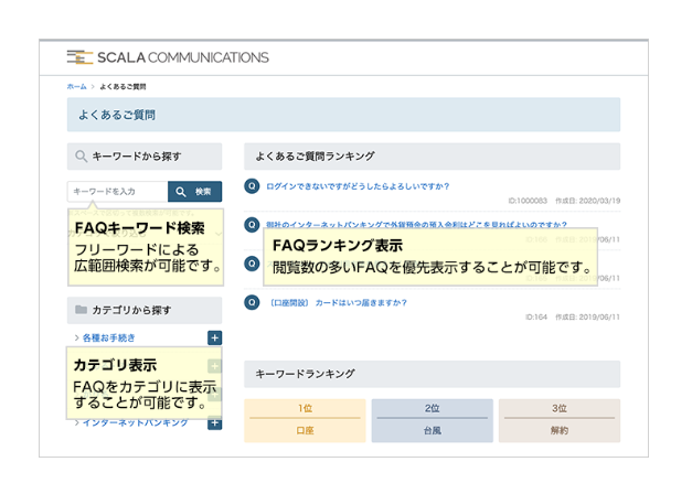 FAQ内の検索が可能になり、ユーザビリティが向上。電話やメールでの問い合わせ対応の業務負荷の削減。HTMLの知識がなくても簡単にFAQページを作成・更新。自動更新機能や複数ユーザによる分散管理、マーケティング活用などの機能がある。