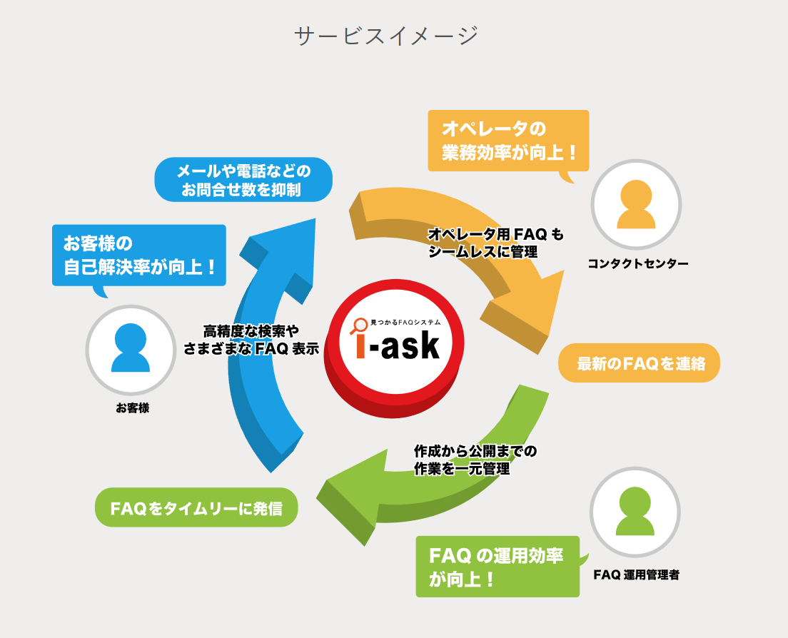 i-askは、企業に寄せられる「よくあるご質問と回答」を簡単に作成・管理することができるFAQ管理サービス。お客様や社員・代理店の方からの質問をWebサイト内に掲載し、自己解決を促進し、顧客満足度の向上と業務効率化を実現。