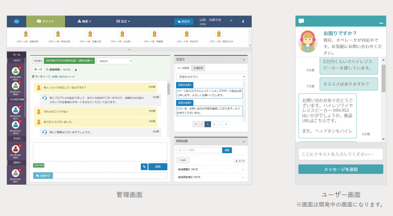 導入が簡単で、数行のタグをサイトに埋め込むだけ。i-ask(FAQ ページ)と連動し、オペレータがコンテンツ内容を確認しながら応対。チャット内の会話からキーワードで連動し、行動履歴も確認可能。