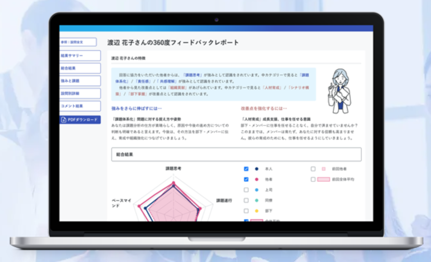直観的に理解できるデザインのレポートを提供。これにより、自分の気づかない強みや課題を瞬時に把握することができます。また、評価の結果を具体的に可視化することで、フィードバックの質も向上します。