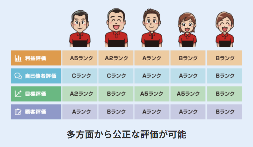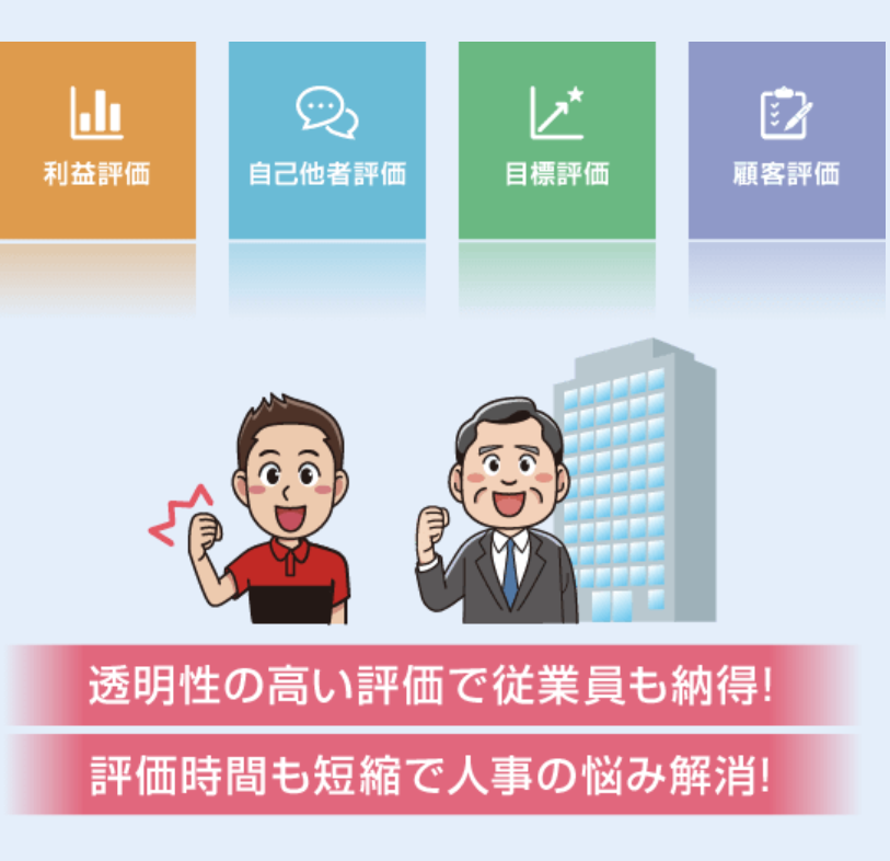 「Step Up Cloud」は、「利益評価」・「自己他者評価」・「目標評価」・「顧客評価」の4つの評価を取り入れ、多方面から適正かつ透明性の高い評価を行います。