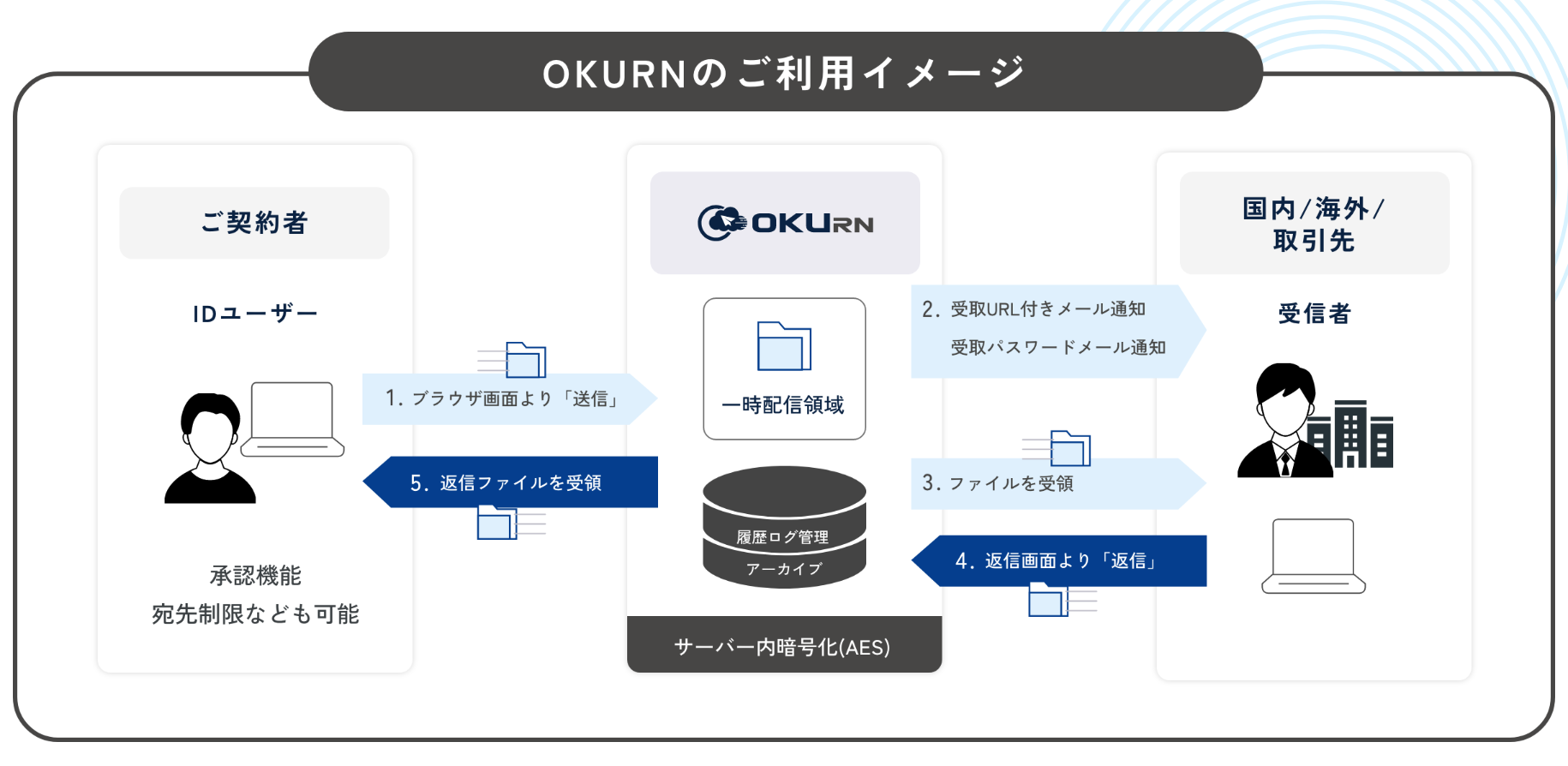 OKURNは、20年以上の歴史と多くの実績を誇る法人向けクラウドストレージGigaCCの高いセキュリティと利便性を継承。情報漏えいを防ぎ、定額運用が可能なファイル転送サービス。