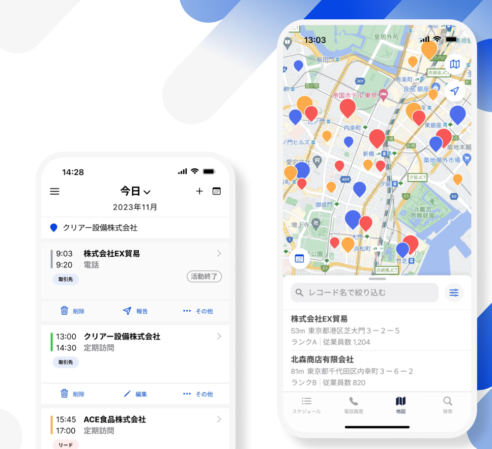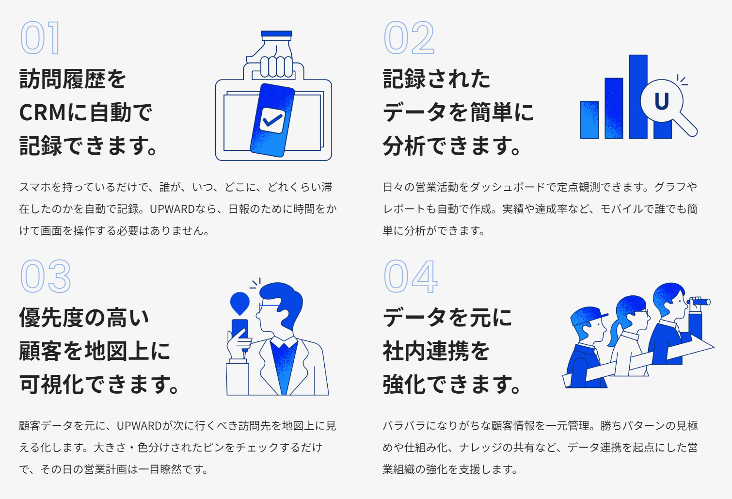 UPWARDはフィールドセールスに特化した顧客データの記録・活用を効率化するアプリ。訪問履歴の自動記録、データの簡単な分析、地図上の顧客可視化、データを元にした社内連携の強化などの機能を提供。