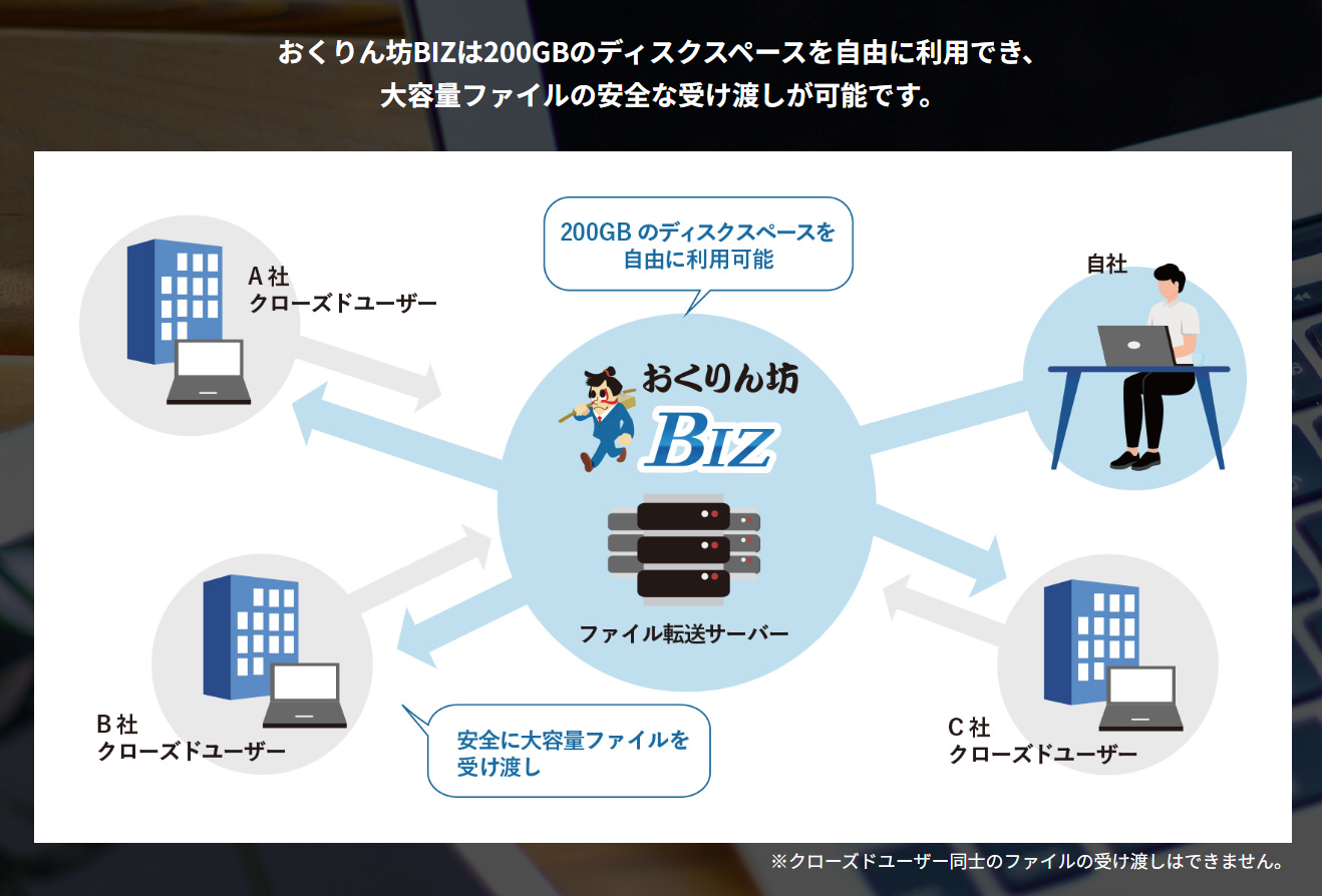 おくりん坊BIZは200GBのディスクスペースを自由に利用できるため、大容量ファイルの安全な受け渡しが可能。また、クローズドユーザー同士のファイルの受け渡しはできません。