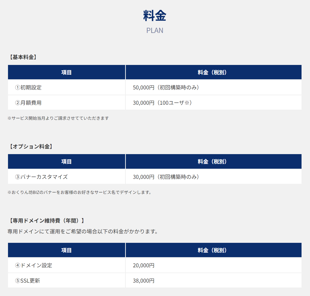 初期設定:50,000円、月額費用:30,000円(100ユーザ)