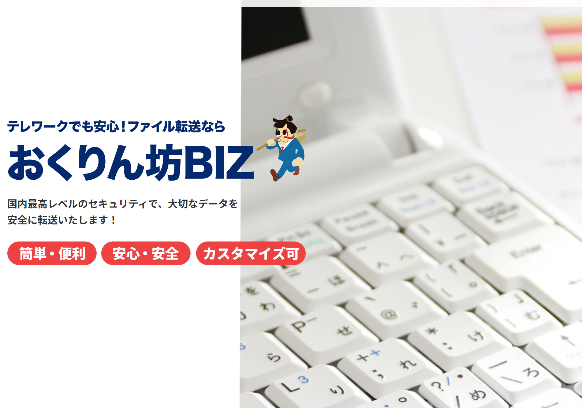 おくりん坊BIZは200GBのディスクスペースを自由に利用でき、大容量ファイルの安全な受け渡しが可能です。国内最高レベルのセキュリティを誇るデータセンターを採用し、ネットワーク技術者不要ですぐにスタート可能。ドメインや管理画面などもお客様仕様にカスタマイズ可能。