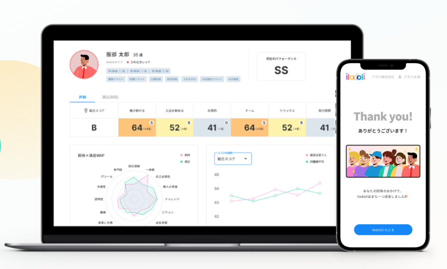 ilodoliは従業員の”働くマインド”と人事データから組織や個人の課題を解析し、解決に向けたアクションを提案します。価値観の発見やチームメンバーの理解が深まります。