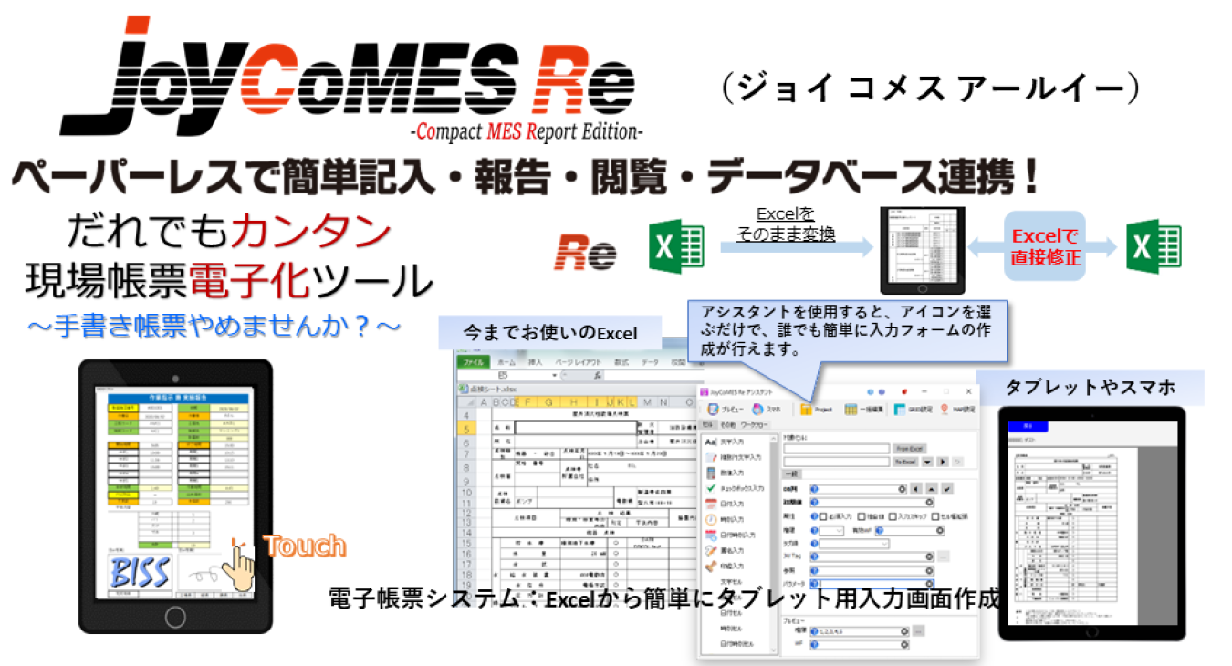 Joy CoMES Reは、Excelファイルから簡単に電子帳票化できるシステムです。業務日報や作業実績収集データ、アンケート、チェックリストなどをタブレットで運用できます。Windows/iOS/Androidに対応し、帳票作成ツールもあり、データの集計や抽出も簡単に行えます。基幹システムとの連携も可能です。