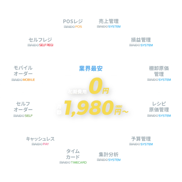 MAIDO SYSTEMは、売上管理から勤怠管理、レシピ原価管理まで、飲食店経営に必要な機能を備えたオールインワンクラウドシステムです。月額1,980円からの業界最安クラスの利用料で、省人化と一気通貫管理を実現し、飲食店DX化をサポートします。